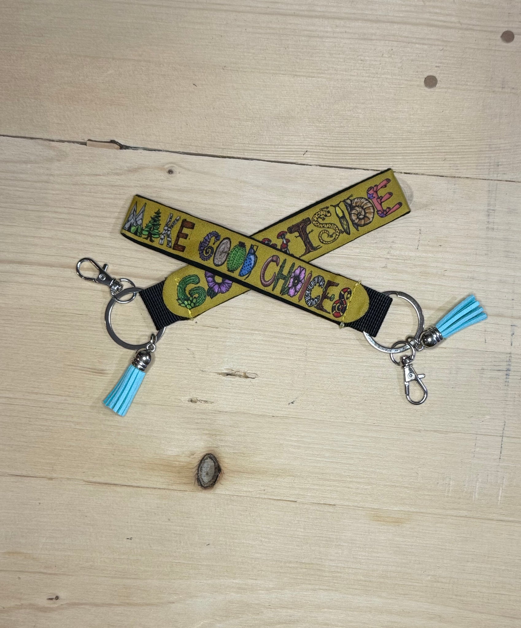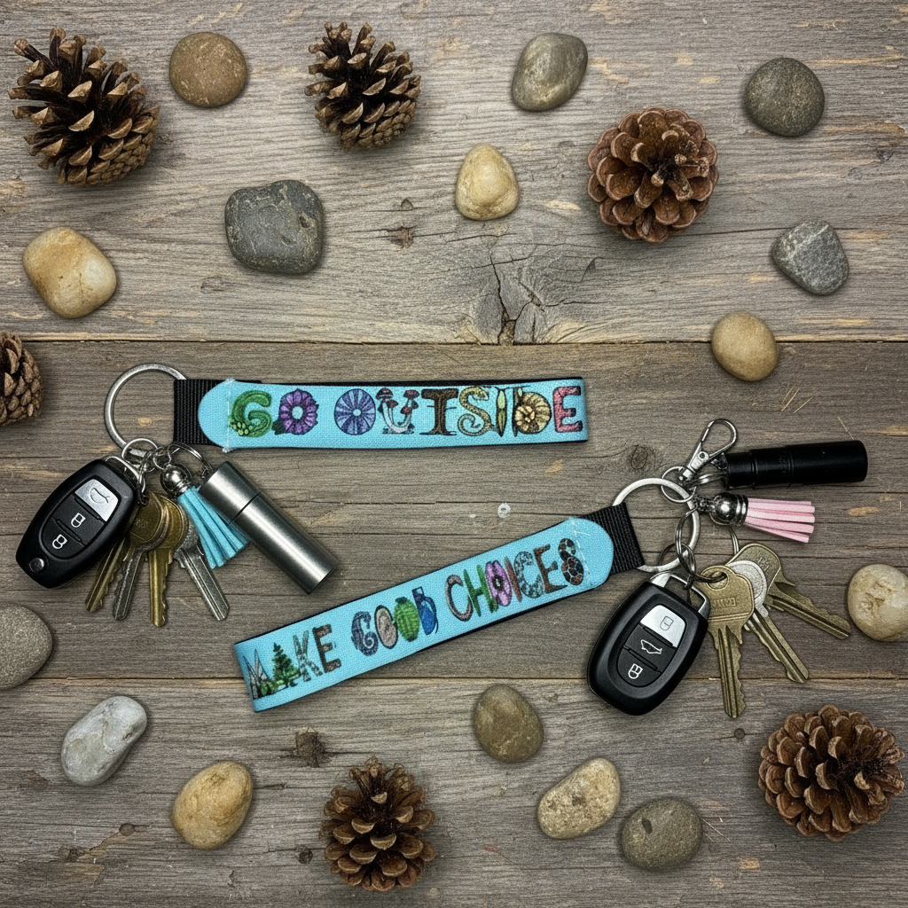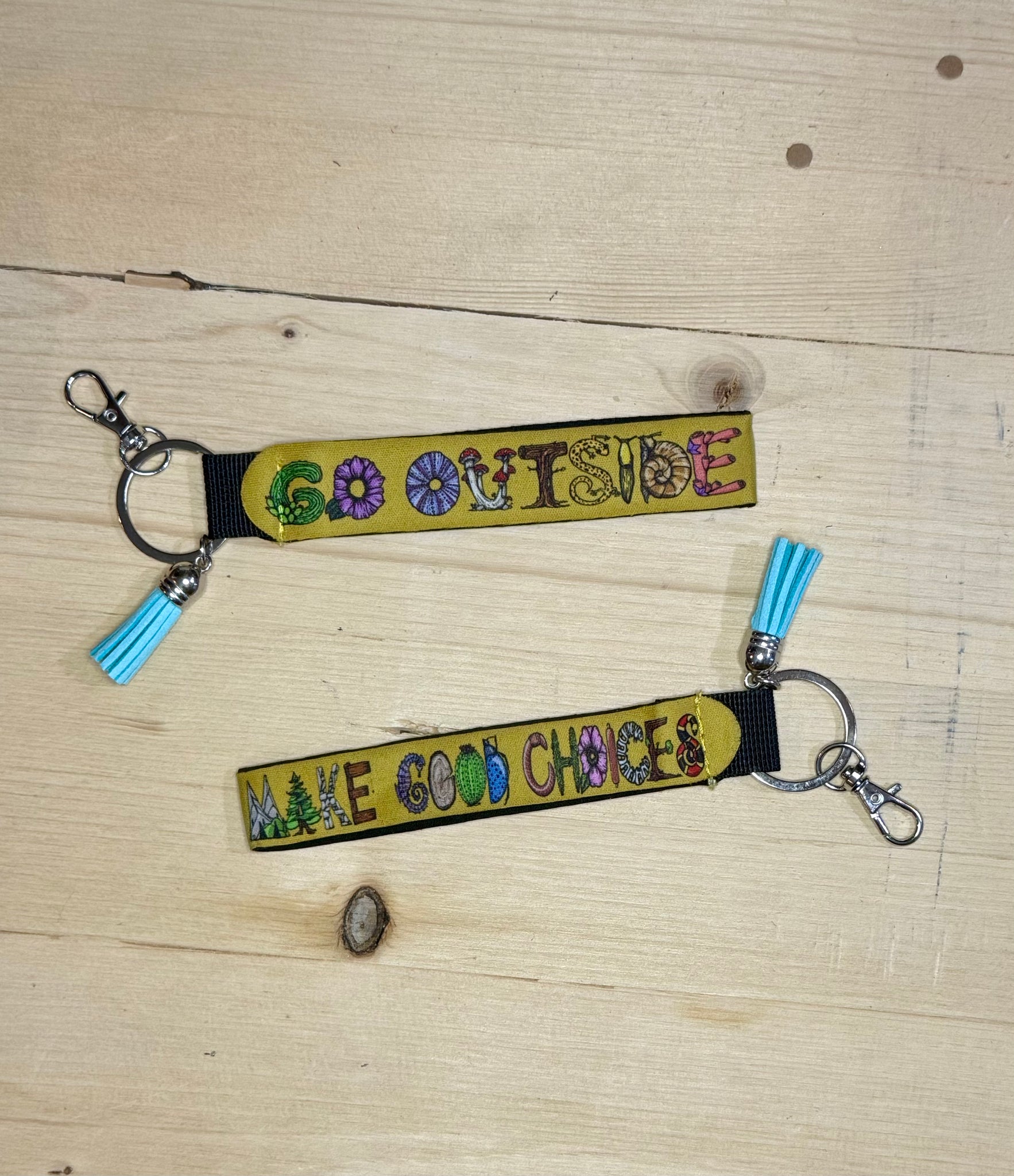 Printed with the slogan. "Go outside."  On one side and "Make Good Choices." On the other with Heidi's original nature themed font.