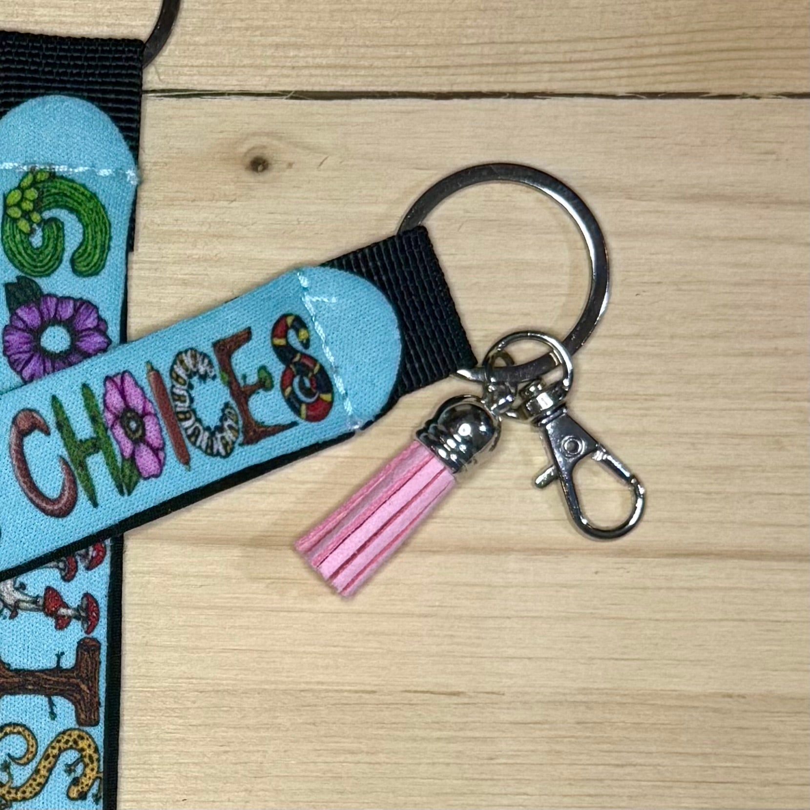 Soft neoprene wristband key chains come with the standard key chain loop, a lobster claw and then a tassel in either your choice of pink or teal.
